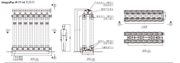 | 組件數目 | IntegraPacTM集成膜塊 | 總膜面積 | 流速 | 長度(L) | 寬度 | 高度(H) | 重量,干態(包括組件) | 重量,注滿水(包括組件) | 總容積 | ||||||||
